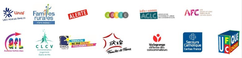 * L’Unaf, Familles Rurales, le collectif Alerte, le Secours Catholique- Caritas France, la CLCV, l’UFC Que Choisir, Familles de France, la CNAFC, Emmaüs France, le CNAFAL, l’ADEIC, l’ALLDC et l’ACLC