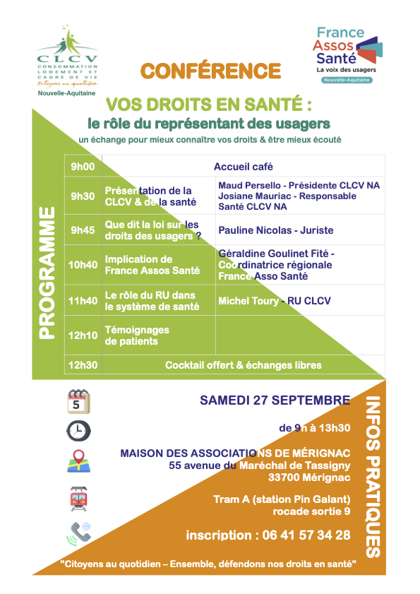 La CLCV Nouvelle-Aquitaine et France Assos Santé Nouvelle-Aquitaine vous invitent à participer à une matinée d’échanges autour des droits des usagers et du rôle essentiel des représentants des usagers (RU) dans le système de santé !