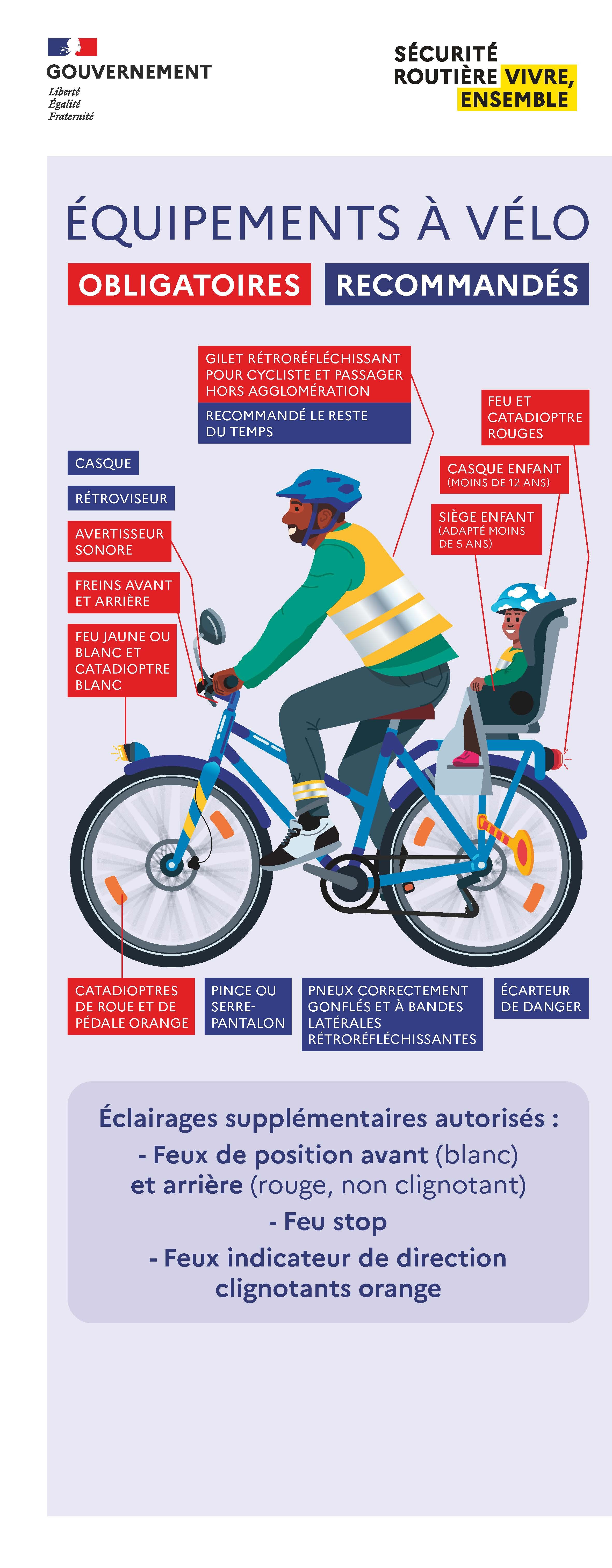 Pour circuler légalement, un vélo doit être équipé de plusieurs dispositifs destinés à garantir la visibilité du cycliste et sa capacité à s’arrêter et se mouvoir en toute sécurité. La réglementation impose deux systèmes de freinage efficaces, à l’avant et à l’arrière, un feu avant diffusant une lumière blanche ou jaune non éblouissante et un feu arrière rouge. Des dispositifs réfléchissants (catadioptres) propres et visibles sont également imposés à l'avant et à l'arrière du vélo et sur les les pédales, ainsi que des éléments visibles latéralement (bandes réfléchissantes sur le tour de la roue ou catadioptres dans les rayons). Les catadioptres doivent être blancs à l’avant, rouges à l’arrière, oranges sur les pédales. Autres équipements obligatoires : une sonnette ou un avertisseur sonore audible à au moins 50 mètres. Ces matériels ne sont pas accessoires. Ils permettent aux autres usagers d’identifier le vélo, d’anticiper ses mouvements et de réduire les risques de collision, en particulier la nuit ou par mauvaise visibilité.